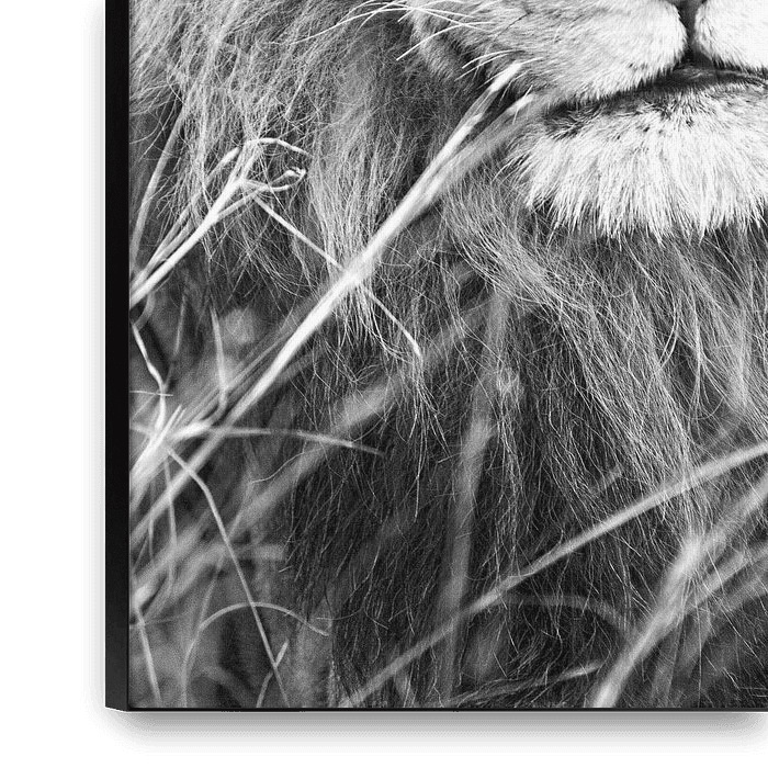 Bestelle dieses Löwen-Wandbild Mighty Lion schwarz und weiß von Lotje Hondius als Reproduktion auf Leinwand, Alu-Dibond, als Poster, Fototapete oder Acrylglasbild.