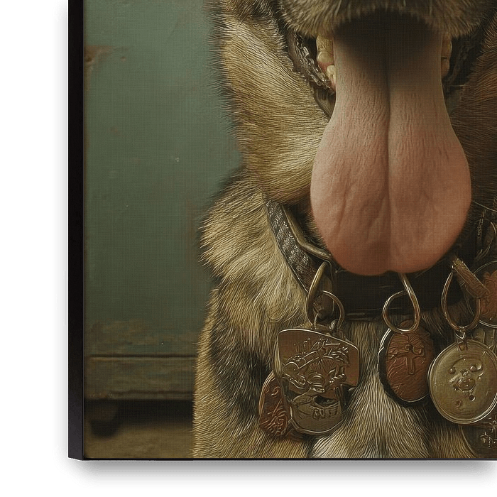 Eine fröhliche und dekorative Hommage an Loyalität und Führungsqualitäten mit einer Anspielung auf militärische Erhabenheit. Der Deutsche Schäferhund trägt Orden und eine Offiziersmütze, aber sein Lächeln macht ihn sympathisch und charmant. Ideal für Räume, die Stärke und Charakter ausstrahlen sollen. Der fröhliche Kontrolleur…