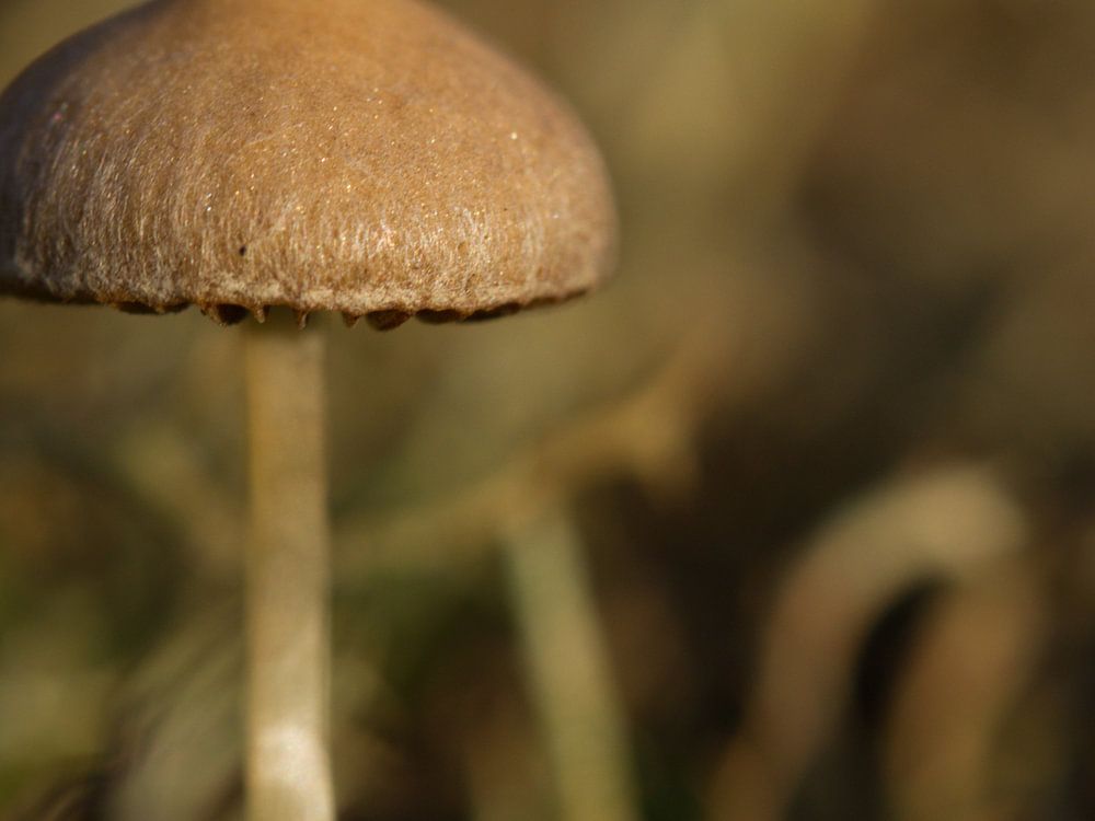 Dieses Makrobild vergrößert diesen 1 cm hohen Pilz enorm. Man kann sogar die Fasern auf der Kappe sehen.