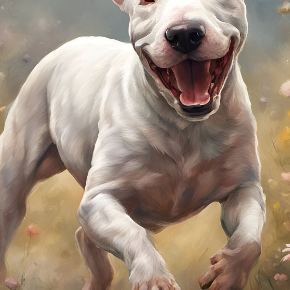 Dieses lebendige und skurrile digitale Kunstwerk fängt die Freude eines Miniatur-Bullterriers ein, der in einem Feld voller Wildblumen spielt. Der verspielte Ausdruck des Hundes und seine energiegeladene Körpersprache sind perfekt eingefangen, und die hellen und fröhlichen Farben der Blumen vermitteln ein Gefühl von Glück und unbeschwertem Spaß.