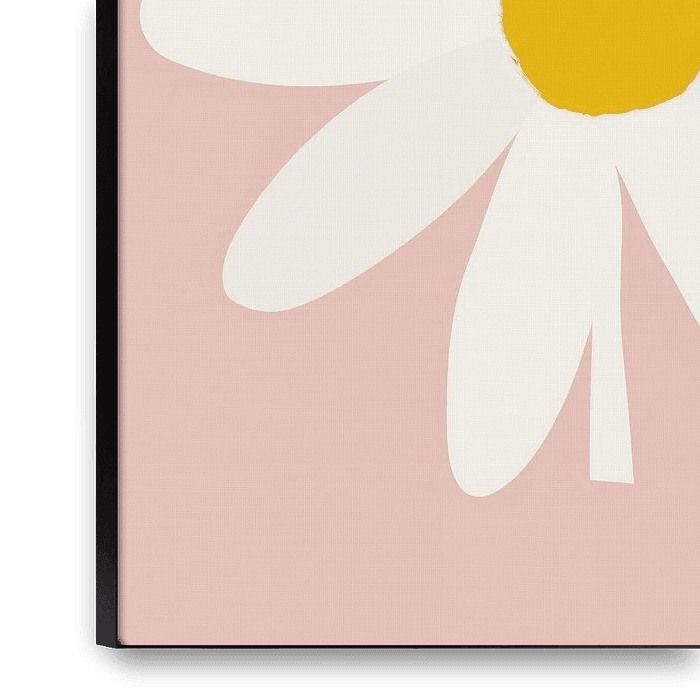 Eine einzelne übergroße Margerite füllt den Rahmen vor einem zartrosa Hintergrund. Die Blume ist auf einfache organische Formen reduziert: Breite elfenbeinfarbene Blütenblätter strahlen von einem warmgelben Zentrum aus und schaffen eine ruhige und ausgewogene Komposition. Ein Blütenblatt trägt einen subtilen hellen Akzent, der ein…