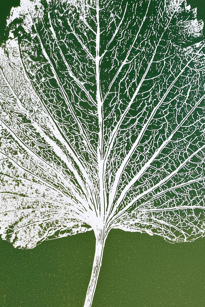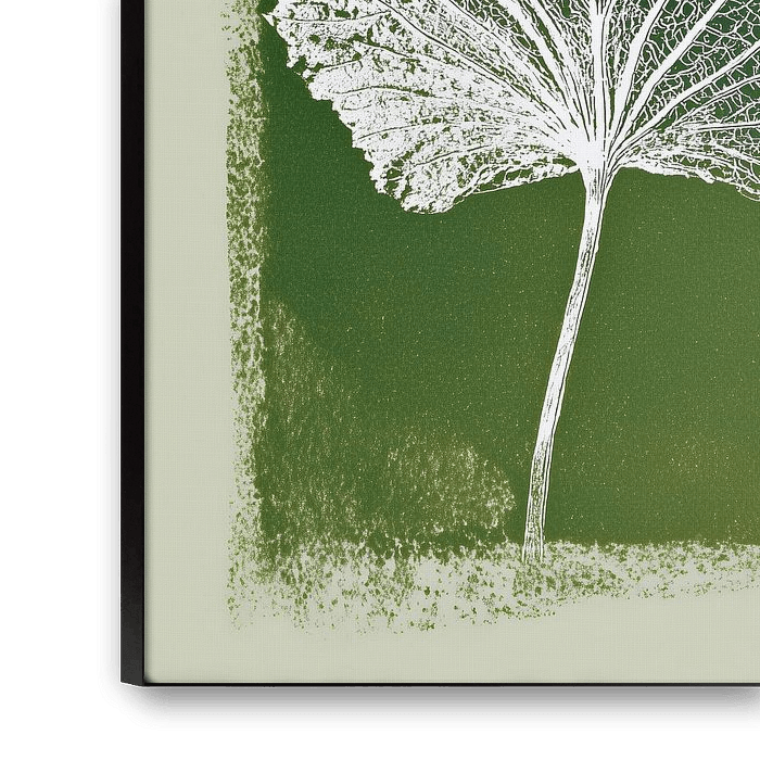 Bringen Sie Ruhe und Schlichtheit in Ihr Interieur mit diesem minimalistischen Blattdruck, der im Stil eines Tintenstempels gestaltet ist und sich vor einem weichen, grünen Hintergrund abhebt. Die detaillierte Blattstruktur bildet einen schönen Kontrast zu dem beruhigenden Grün und erzeugt einen zeitlosen und natürlichen Effekt.