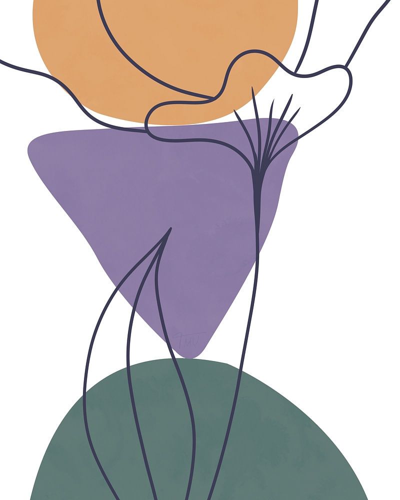 Minimalistische Landschaft mit einer dunkelblauen Linienzeichnung einer Blume und drei organischen Formen in Orange, Lila und Grün-Blau. Die Formen sind mit Aquarellfarbe mit sichtbarer Textur gemalt; der Hintergrund ist weiß.