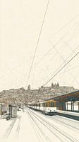 Dieses Kunstwerk zeigt eine detailreiche und minimalistische Strichzeichnung eines Bahnsteigs mit einem Zug im Vordergrund und einer Stadt im Hintergrund. Das zentrale Motiv besteht aus einem modernen Bahnhof, einem Zug mit klaren Formen und einer hügeligen Stadt voller Gebäude, die stufenweise nach oben zu laufen scheinen. Die Farben…