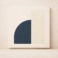 Dieses Kunstwerk zeigt eine moderne, minimalistische Komposition, in der ein dunkelblauer Halbkreis und eine Reihe vertikaler goldener Linien zusammen ein klares und ausgewogenes Ganzes bilden. Der Halbkreis befindet sich auf der linken Seite des Bildes und steht in starkem Kontrast zu den zehn goldfarbenen Linien auf der rechten Seite.…