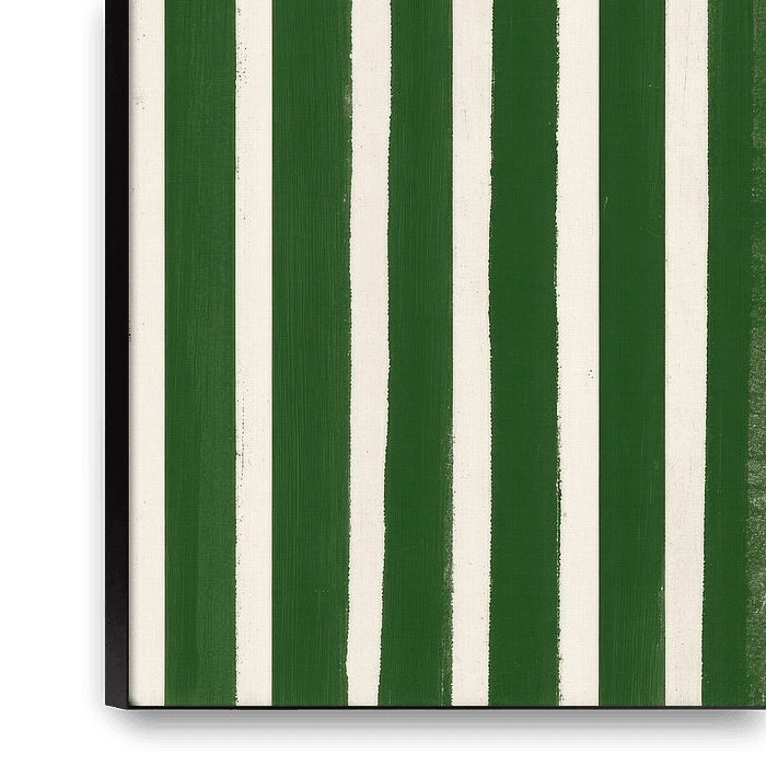 Dieses minimalistische Design zeigt eine abstrakte Komposition mit zwei horizontalen Bereichen. Oben erstreckt sich ein hellrosa Feld, auf dem leicht nach rechts versetzt ein großer weißer Kreis schwebt und als visueller Fokus dient. Die untere Hälfte besteht aus vertikalen grünen Streifen in verschiedenen Grüntönen, gleichmäßig…