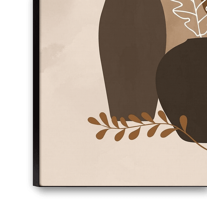 Das minimalistische Stillleben zeigt zwei Vasen mit Blättern und einem Zweig sowie einen einzelnen Zweig im Vordergrund. Eine organische Form hinter den Vasen verstärlt den Eindruck von räumlicher Tiefe. Die Illustration ist gestaltet in Brauntönen (plus Weiß) und daher fast monochromatisch, wodurch eine zeitlose Ästhetik entsteht.