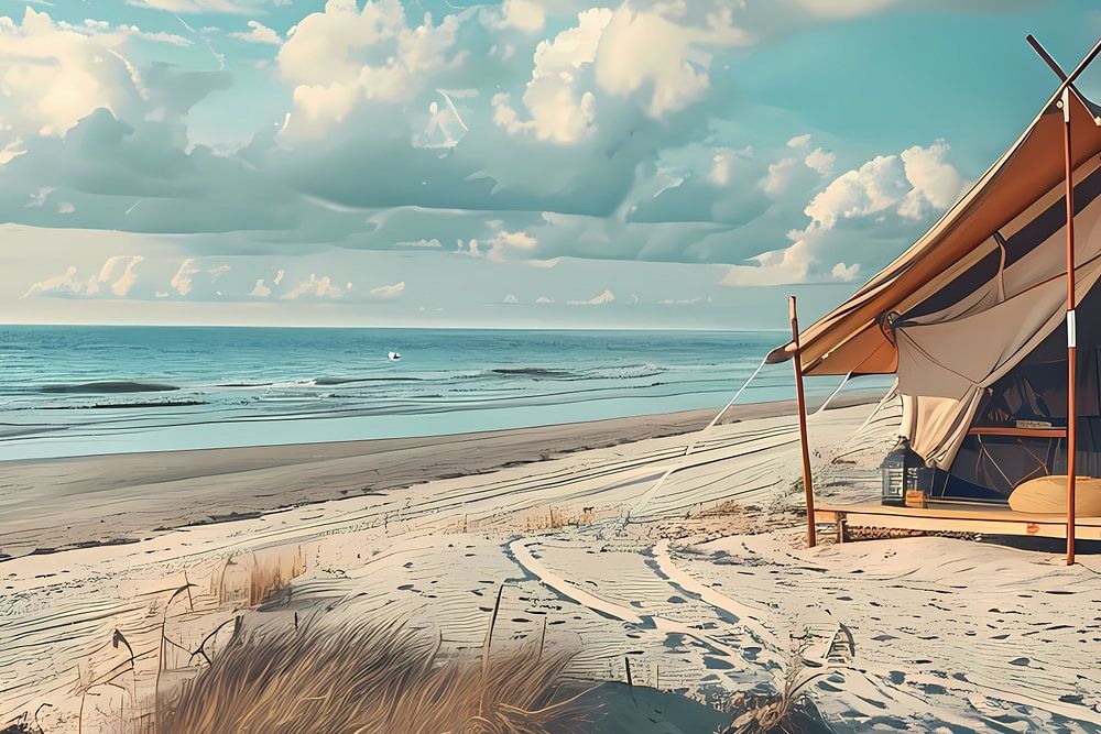 Entfliehen Sie der Ruhe des Strandes mit diesem minimalistischen Foto eines Zeltes im Sand. Perfekt für ein Schlafzimmer oder ein Büro, um einen Hauch von Ruhe zu schaffen.