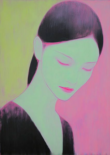 Mint Muse - Het eerste dat zich aan je opent is een hoofd dat naar beneden buigt als een blad dat zijn rand laat zakken. Het gezicht is bijna grafietvrij, een zachte mintgroene huid waarop de trekken nauwelijks drukken: gesloten ogen als twee dunne, roze lijnen, een kleine neus, lippen subtiel aangezet met helder roze. Dit vrouw…