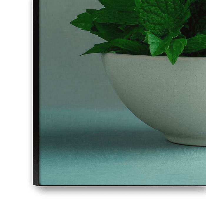 Ein frisches Spiel aus sattem Grün und zauberhaftem Duft entfaltet sich in dieser eleganten Schale. Die leuchtenden Minzblätter laden ein zu kulinarischen Experimenten und verleihen jedem Gericht eine spritzige Note. Perfekt für die Küche, bringt dieses Bild Leben und Frische in jeden Kochbereich, wo Geschmack und Kreativität aufeinandertreffen.
