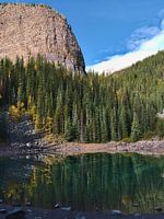 Landschaftsaufnahme des Mirror Lake (Spiegelsee) bei Lake Louise im Banff-Nationalpark, Kanada in den Rocky Mountains mit dem Gipfel des brühmten Big Beehive und Bäumen, die sich im flachen Wasser des Sees spiegeln an einem sonnigen Morgen im Herbst.