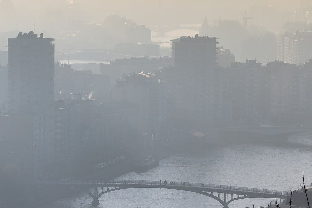 Prachtige mysterieuze opname van de skyline van Luik (Liege), Belgie, op een mistige zonnige winterochtend, met de rivier de maas (meuse) door de stad
