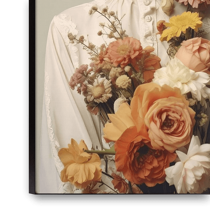 Vintage-Porträt einer jungen Frau mit einer Fülle von Blumen. Anachronistisch, zeitlos, überschwänglich könnten die Schlüsselwörter dieses Porträts sein, das weibliche und florale Schönheit in einem raffinierten und originellen Gesamtbild vereint.