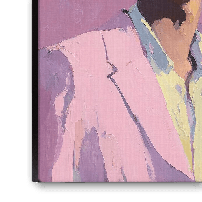 Dieses Gemälde zeigt einen Mann mit breitkrempigem gelbem Hut und schwarzem Band, der Schatten über die Augen wirft. Er trägt schwarze Sonnenbrillen, ein hellgelbes Hemd mit weißem Kragen und einen diagonalen schwarzen Schultergurt. Die Lippen sind rosa betont, während der Mann leicht nach rechts blickt und einen neutralen Ausdruck zeigt. Der Hintergrund ist einfarbig in hellem Lila gehalten. Die Malweise arbeitet mit dicken Pinselstrichen, kräftigen Farben und lockeren Formen, wodurch ein plakatives, modernes Porträt entsteht. Die zentrale Komposition betont Hut, Brille und Farbkontraste.