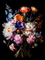 Ein üppiger Strauß voller Pfingstrosen, Anemonen und Ranunkeln entfaltet sich dramatisch vor einem tiefschwarzen Hintergrund. Das Spiel von Licht und Schatten verleiht dem Ganzen einen fast barocken Charakter, als stamme es direkt aus einem Atelier des 17. Jahrhunderts. Ein zeitloses Blumenstillleben, in dem Farbe, Zerbrechlichkeit und…