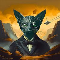 Erleben Sie die kosmische Eleganz von „Mitternachtsschnurrhaare“! Diese atemberaubende digitale Vektorgrafik zeigt eine elegante anthropomorphe Katze in einem schicken Smoking vor dem lebhaften Hintergrund eines geheimnisvollen Planeten, der in warme Orangetöne getaucht ist. Das retrofuturistische Design kombiniert kräftige Linien,…