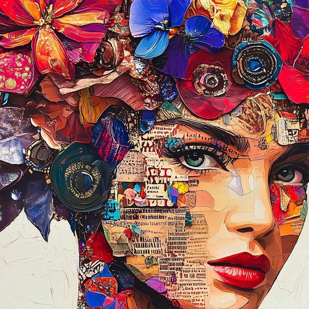 Eine lebhafte Mixed-Media-Collage einer Frau, die eine komplizierte Kopfbedeckung aus buntem Papier und Zeitschriftenausschnitten trägt. Ihre Haut weist eine Reihe von ausgeschnittenen Papierelementen auf. Das Kunstwerk zeigt reiche Farben und Texturen, die das visuelle Interesse der Komposition verstärken.