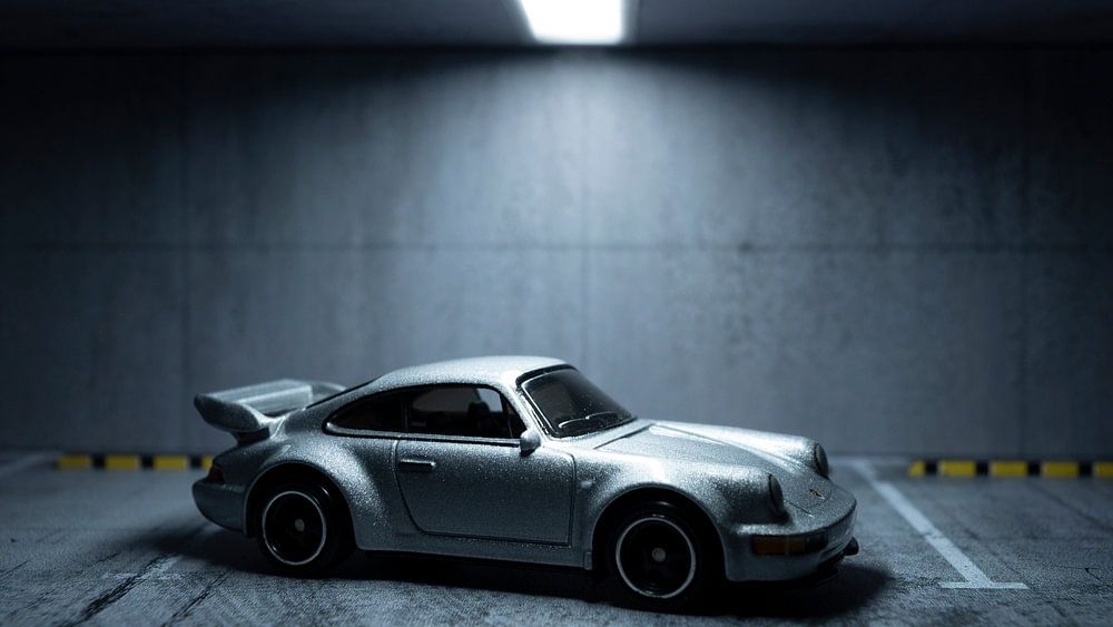 (Modellauto) Porsche in der Garage, schön beleuchtet unter einer Lampe