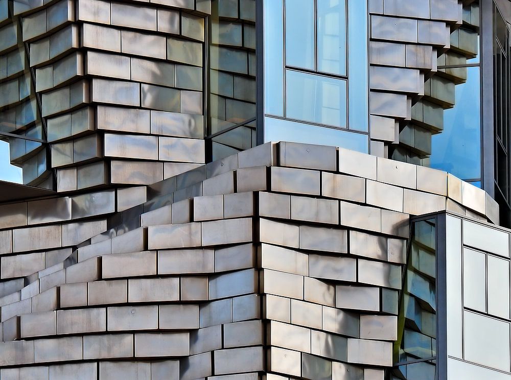 Ein außergewöhnliches Stück Architektur. Ein Puzzle aus zunehmend geraden Flächen, aber das Ganze bildet organische Linien. Es ist ein Teil eines Turms, aber wenn man auf einen Teil zoomt, kann man nur die Genialität sehen.