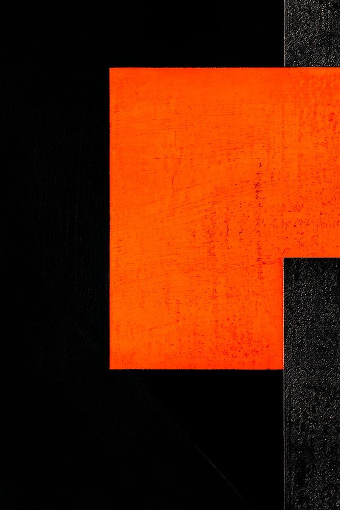 Ein kraftvolles Zusammenspiel von tiefem Schwarz und leuchtendem Orange, das in seiner geometrischen Einfachheit besticht. Die markante Form verleiht dem Raum Dynamik und modernen Chic. Ideal platziert im Wohnzimmer oder Büro, erzeugt dieses Kunstwerk Gesprächsthemen und inspiriert kreative Gedanken. Perfekt für einen zeitgemäßen, stilvollen Look!