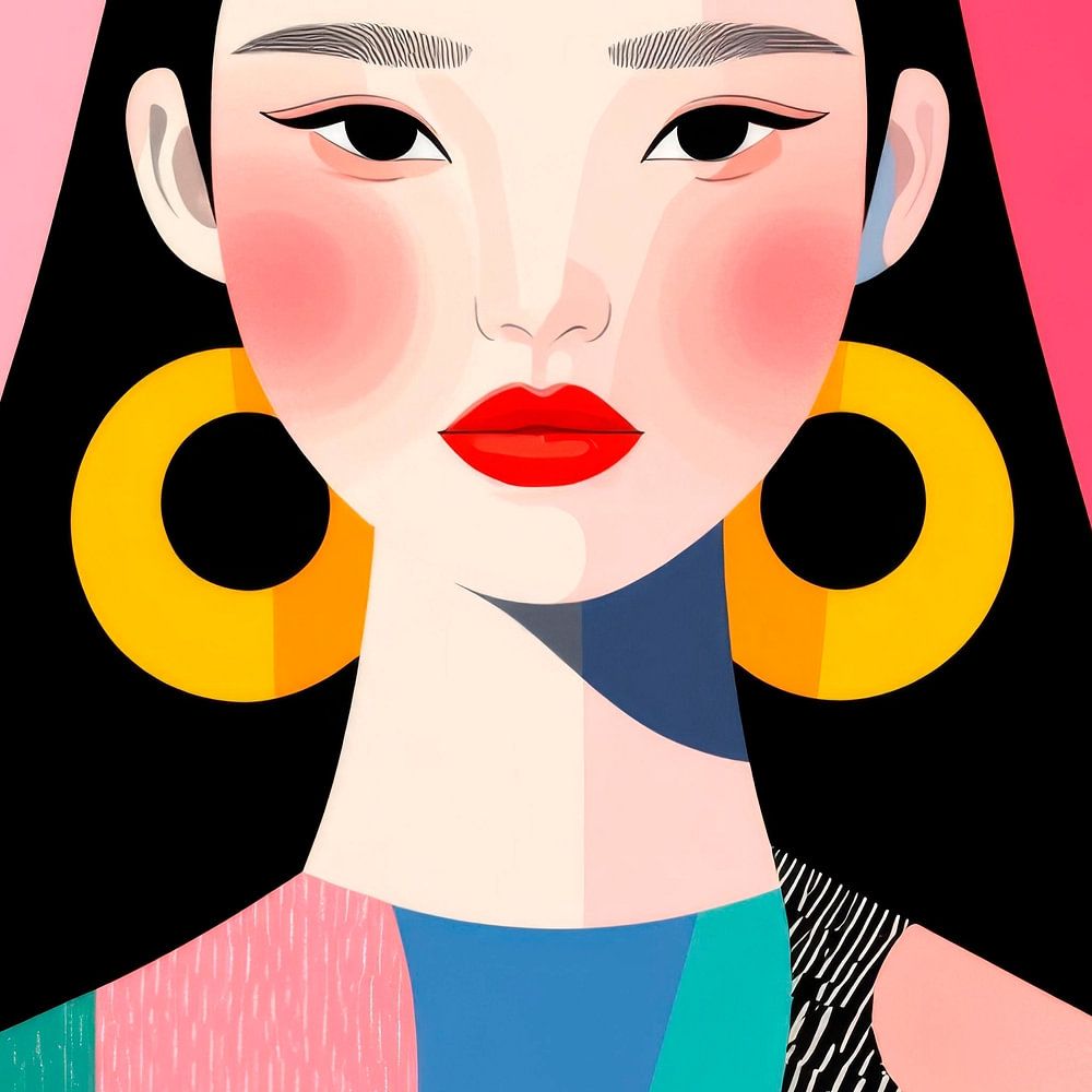 Das Bild zeigt eine stilisierte Porträt einer Frau mit langen, schwarzen Haaren und markanten, gelben Ohrringen. Ihre blassen Wangen und der kräftige, rote Lippenstift verleihen ihr eine auffällige Eleganz. Die geometrischen, bunten Muster im Hintergrund unterstreichen die moderne Ästhetik und schaffen eine dynamische visuelle Komposition.