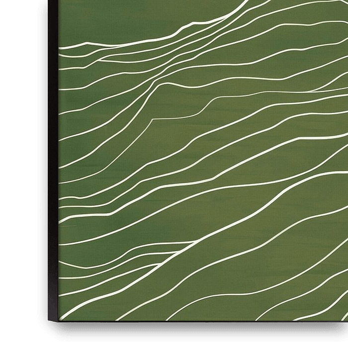 Dieses Bild zeigt eine abstrakte Darstellung einer Berglandschaft, die mit weißen Linien auf einem olivgrünen Hintergrund dargestellt ist. Die Verwendung von einfachen Linien und der Kontrast zwischen den Farben sorgen für ein modernes und anspruchsvolles Aussehen. Dieses Kunstwerk ist perfekt, um jedem Raum im Haus eine ruhige und…
