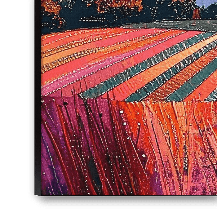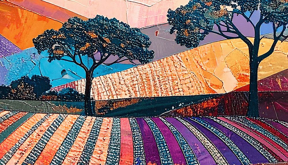 Eine farbenfrohe, abstrakte provenzalische Berglandschaft mit einer mehrfarbigen Leinenstruktur und ungewöhnlichen Guilloche-Mustern.