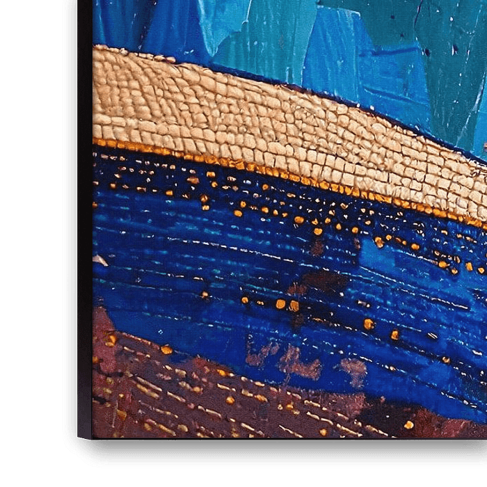 Eine farbenfrohe abstrakte mediterrane Gebirgslandschaft mit einer mehrfarbigen Leinenstruktur und ungewöhnlichen Guillochiermustern.