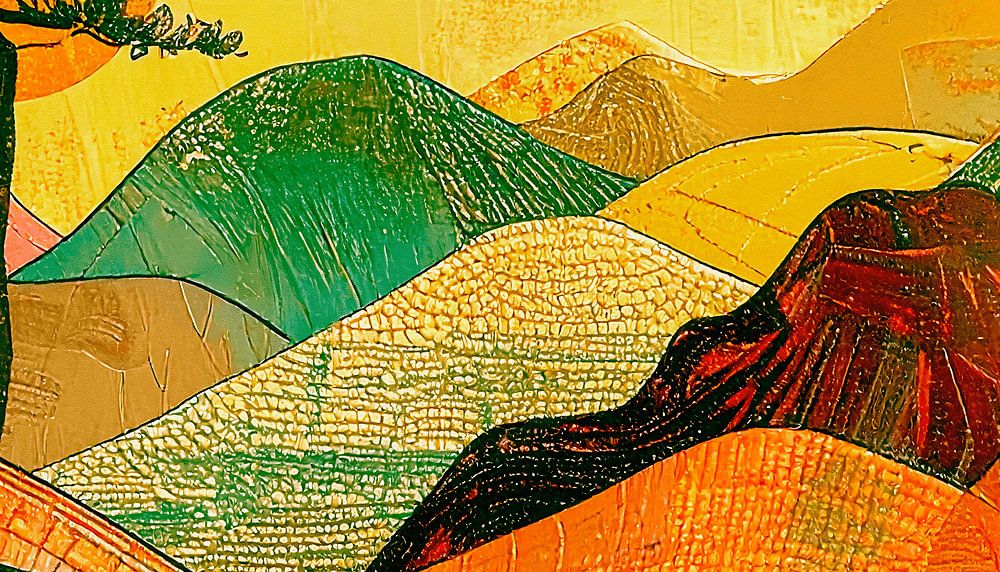 Eine farbenfrohe, abstrakte Berglandschaft mit mehrfarbiger Leinenstruktur und ungewöhnlichen Guilloche-Mustern.