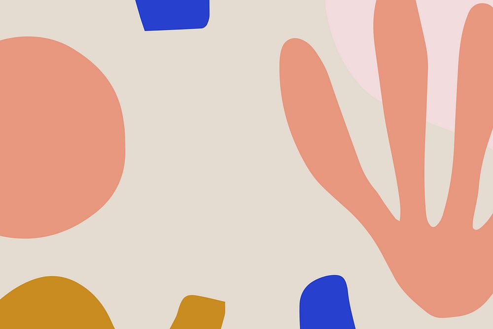 Moderne, trendige Collage mit geometrischen und organischen Formen in schön abgestimmten Farben. In Blau, Rosa, (Hell-)Orange und (Senf-)Gelb. Ausgewogene Zusammensetzung. Verspielt und modern.