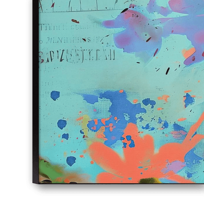 Modern Feminine - Eine Explosion von Blumenmustern und Farbspritzern umgibt das Profil einer Frau, die in einer Harmonie aus Abstraktem und Figürlichem eingefangen ist. Der Stil mischt Einflüsse der urbanen Kunst mit Pop-Art-Elementen. Vor einem Hintergrund aus urbanen Texten und Notationen überwiegt Aquablau, das durch Akzente in Neonorange und Pink verstärkt wird.