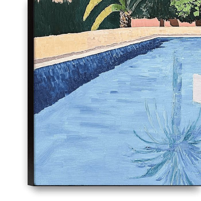 Bestelle dieses Landschafts-Wandbild Modernes Gemälde mit Villa, Pool und Palmen von Vlindertuin-Art als Reproduktion auf Leinwand, Alu-Dibond, als Poster, Fototapete oder Acrylglasbild.