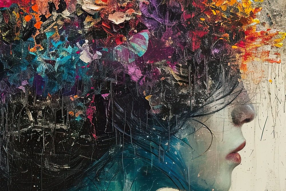 Details: Frau, Portrait, Blumen, Schmetterlinge, farbenfroh, Kunst, Malerei, modern, ausdrucksstark, Leinwand