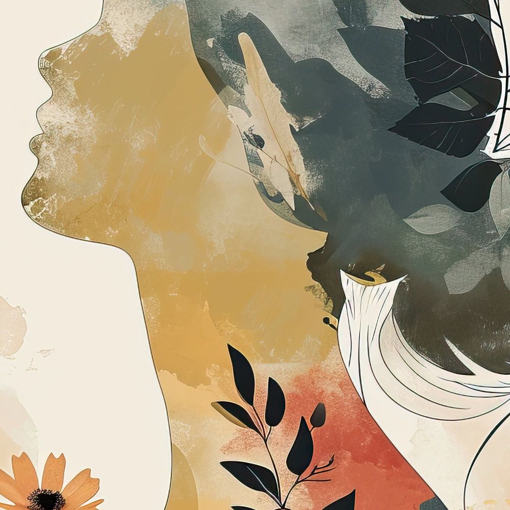 Modernes Porträt | Natürliche Harmonie - In diesem poetischen Werk gehen Natur und weibliche Anmut nahtlos ineinander über; die weibliche Silhouette ist mit Ocker- und Rosttönen angereichert und mit zarter Flora und Fauna verwoben. Der subtile Aquarellhintergrund mit weichen Pastelltönen bildet einen verträumten Kontrast zu den erdigen, organischen Formen.