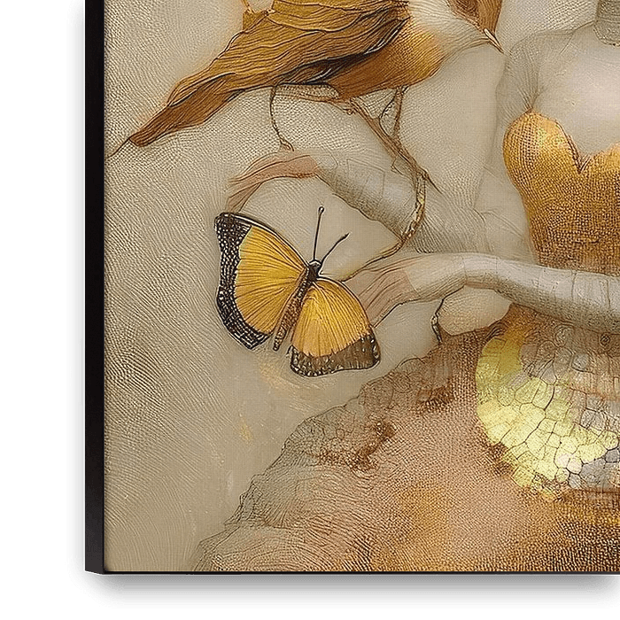Bestelle dieses Vögel Wandbild Modernes Porträt eines Mädchens mit einem Vogel, Serie verträumtes Gold von Studio Pieternel als Reproduktion auf Leinwand, Alu-Dibond, als Poster, Fototapete, ArtFrame oder Acrylglasbild, maßgefertigt in höchster Qualität.
