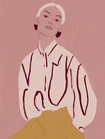 Eine moderne Frau, eingefangen in sanften Tönen und fließenden Linien. Ihre Pose strahlt subtiles Selbstbewusstsein aus, während die herzförmigen Ohrringe einen Hauch von Verspieltheit hinzufügen.