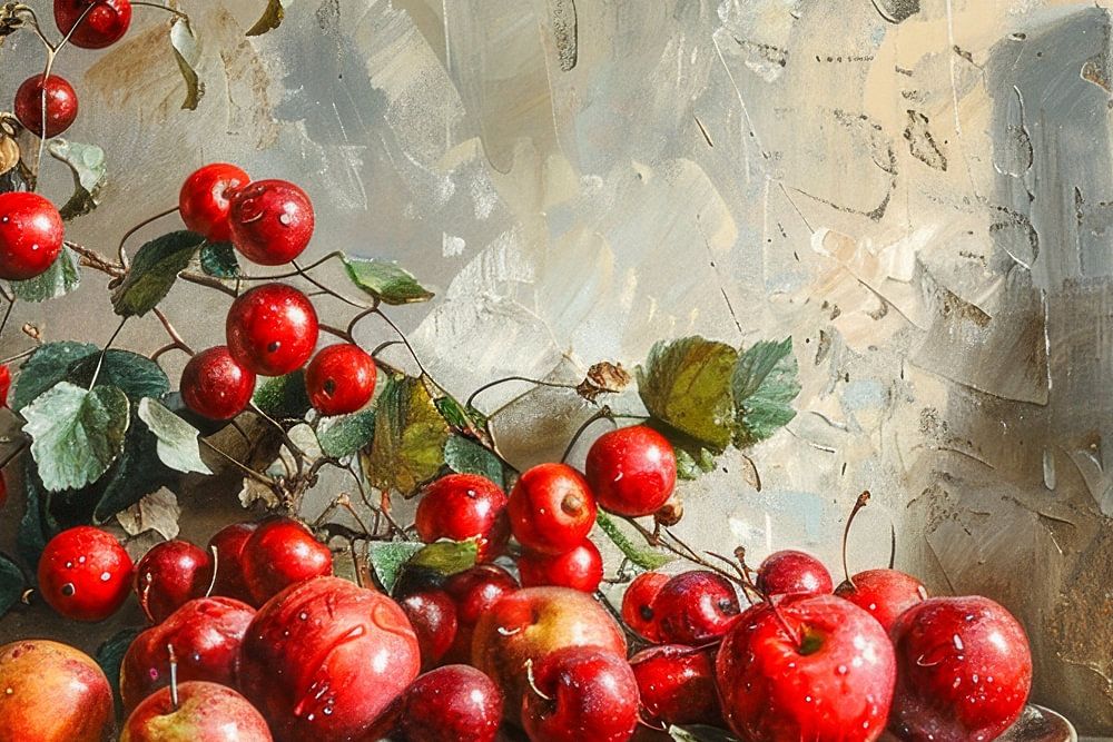 Ein wunderschönes Stillleben, das eine Fülle von bunten Früchten und eine raffinierte Flasche Wein in einer ruhigen und harmonischen Weise präsentiert. Die leuchtenden Farben und die sorgfältig arrangierte Komposition schaffen eine einladende Szene, die den Betrachter dazu einlädt, die Details des Kunstwerks zu erkunden und zu schätzen.