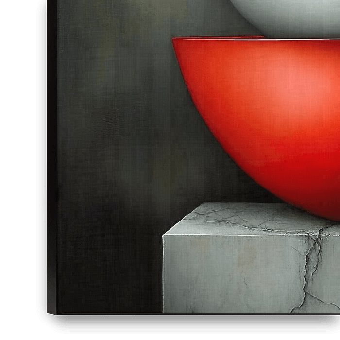 Ein minimalistisches, modernes Stillleben für drei sorgfältig gestapelte Schalen in verschiedenen Farbtönen: warmes Rot unten, sanftes Beige in der Mitte und kühles Grau oben. Die Schalen haben klare Linien und eine matte Oberfläche, wodurch sie sowohl zeitgemäß als auch zeitlos wirken. Die Komposition ist einfach und doch kraftvoll und…