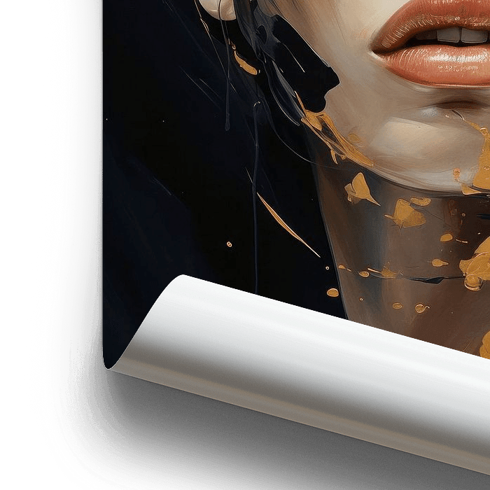 Modernes abstraktes Porträt in Schwarz und Orange/Goldtönen. Ein echter Blickfang, von dem man nicht genug bekommen kann! Wählen Sie die Größe und das Material selbst und machen Sie es zum perfekten Werk für Ihr Interieur.