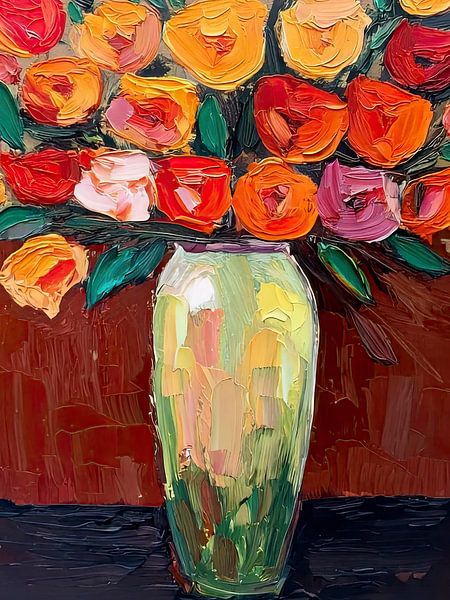 Dieses moderne Werk mit Rosen in einer Vase mit digitaler Impasto-Technik ist Teil einer Sammlung von farbenfrohen Stillleben, diese Werke finden Sie im Album: Moderne abstrakte farbenfrohe Kunst mit Blumen