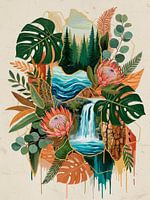Bestelle dieses abstrakte Wandbild Modernes biophiles Design mit exotischen Blumen und Wasserfall von Studio Pieternel als Reproduktion auf Leinwand, Alu-Dibond, als Poster, Fototapete oder Acrylglasbild.