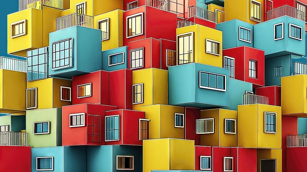 Dieses Bild zeigt ein modernes, farbenfrohes Gebäude, das aus gestapelten Apartments besteht und vor einem strahlend blauen Hintergrund steht. Die architektonische Gestaltung des Gebäudes ist innovativ und verspielt, mit lebendigen Farben, die eine einladende und dynamische Atmosphäre schaffen. Die verschiedenen Ebenen und Fensterformen verleihen dem Gebäude Charakter und Individualität, während die harmonische Farbpalette den urbanen Raum lebendig und attraktiv erscheinen lässt. Dieses Bild repräsentiert die zeitgenössische Architektur und die Kreativität im Wohnungsbau, die sowohl Funktionalität als auch Ästhetik vereint.