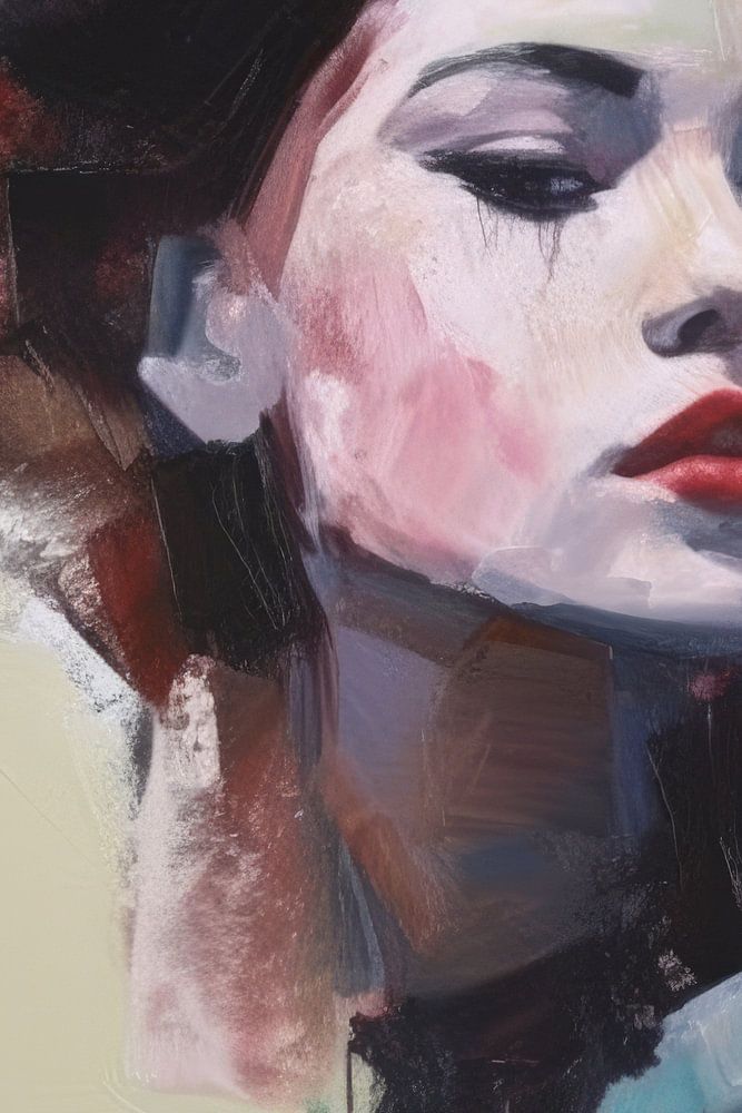 Modernes, farbenfrohes Porträt einer jungen Frau. Pastellfarben kombiniert mit wärmeren Farben verleihen diesem Werk feine Kontraste und eine schöne Atmosphäre.