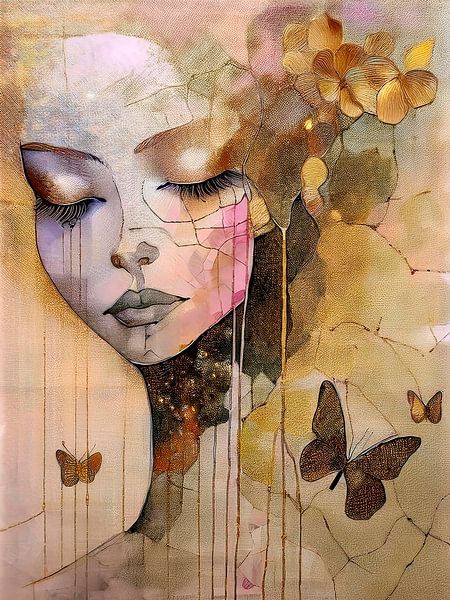 Über „Modernes schickes Porträt einer Frau mit Schmetterlingen und goldenen Blumen“ von Studio Pieternel