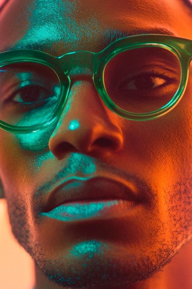 Ein faszinierendes Porträt, das mit lebendigen Farben und einem hypnotisierenden Hintergrund spielt. Die kräftigen, grünen Brillengläser und der entschlossene Ausdruck strahlen Kreativität und Stil aus. Ideal für den inspirierenden Raum eines Büros oder kreativen Studios, um den Geist anzuregen und spannende Gespräche zu fördern.
