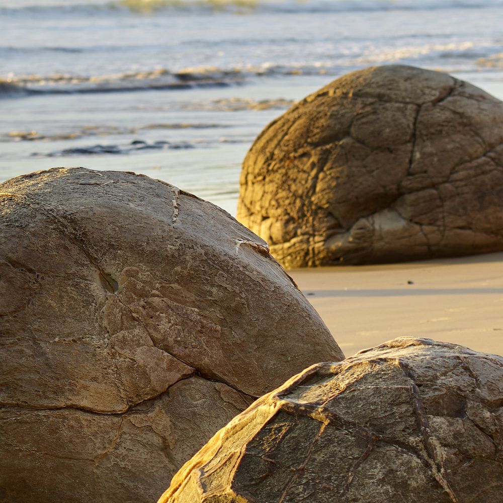 Die Moeraki Boulders sind ungewöhnlich große und kugelförmige Felsbrocken, die entlang eines Abschnitts des Koekohe Beach an der wellengeschnittenen Otago-Küste Neuseelands zwischen Moeraki und Hampden liegen.