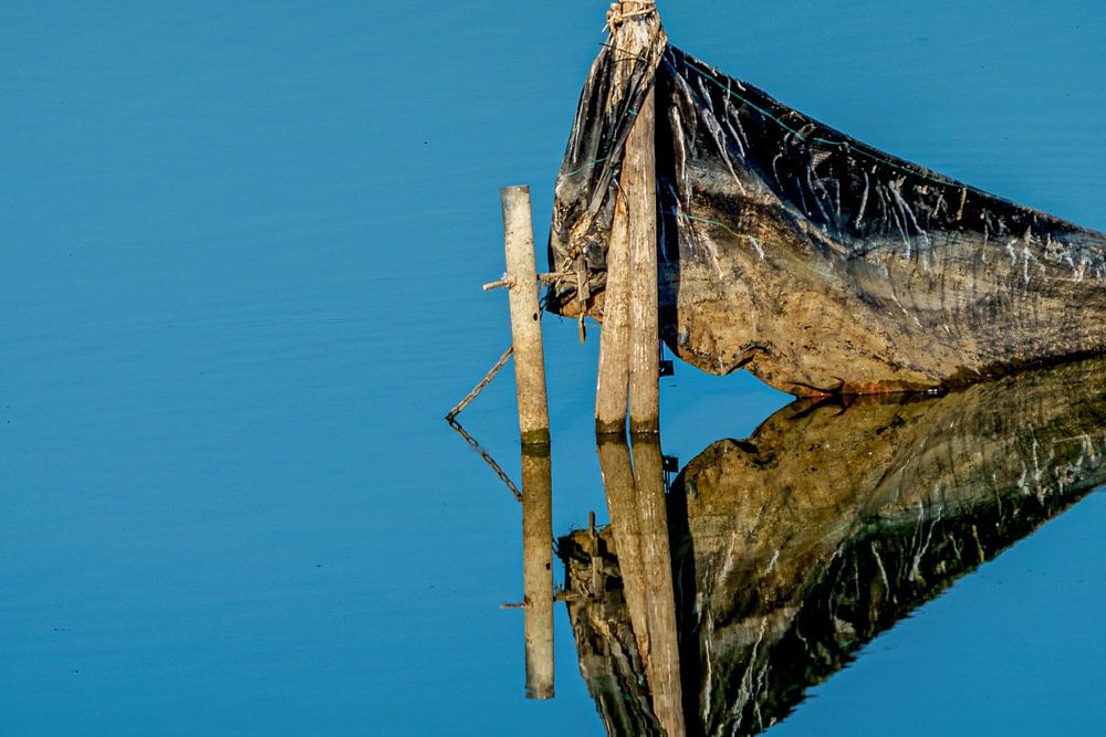 Eine Möwe auf einem Foto mit einem Netz. In spiegelglattem Wasser mit Reflexion. Das Wasser ist wirklich klar und blau.