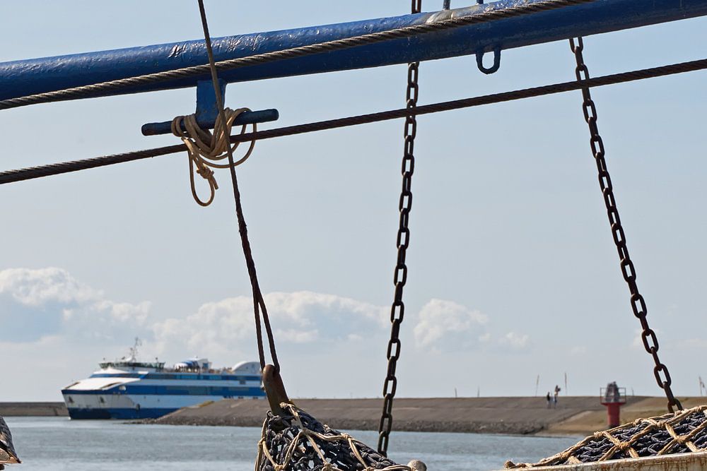 Möwen auf einem Fischerboot im Hafen von Harlingen. Im Hintergrund das Boot nach Terschelling.