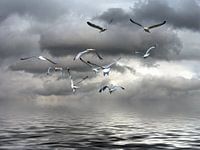 Bestelle das Foto Möwen über der wolkigen See von Edgar Schermaul als Reproduktion auf Leinwand, Alu-Dibond, als Poster, Fototapete oder Acrylglasbild.