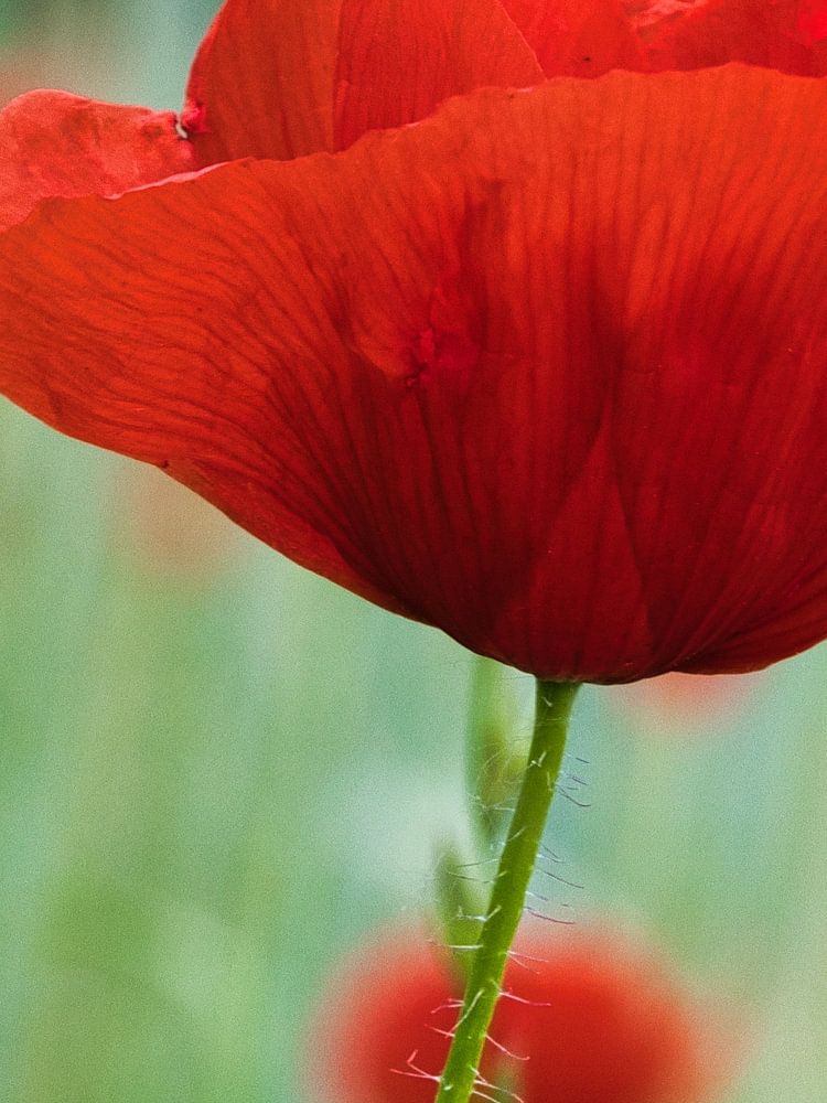 Mohnblume mit roten Blütenblättern. Mohnblumen Feld. Rote Blüten mit grünen Blättern. Frühsommer Blumen.